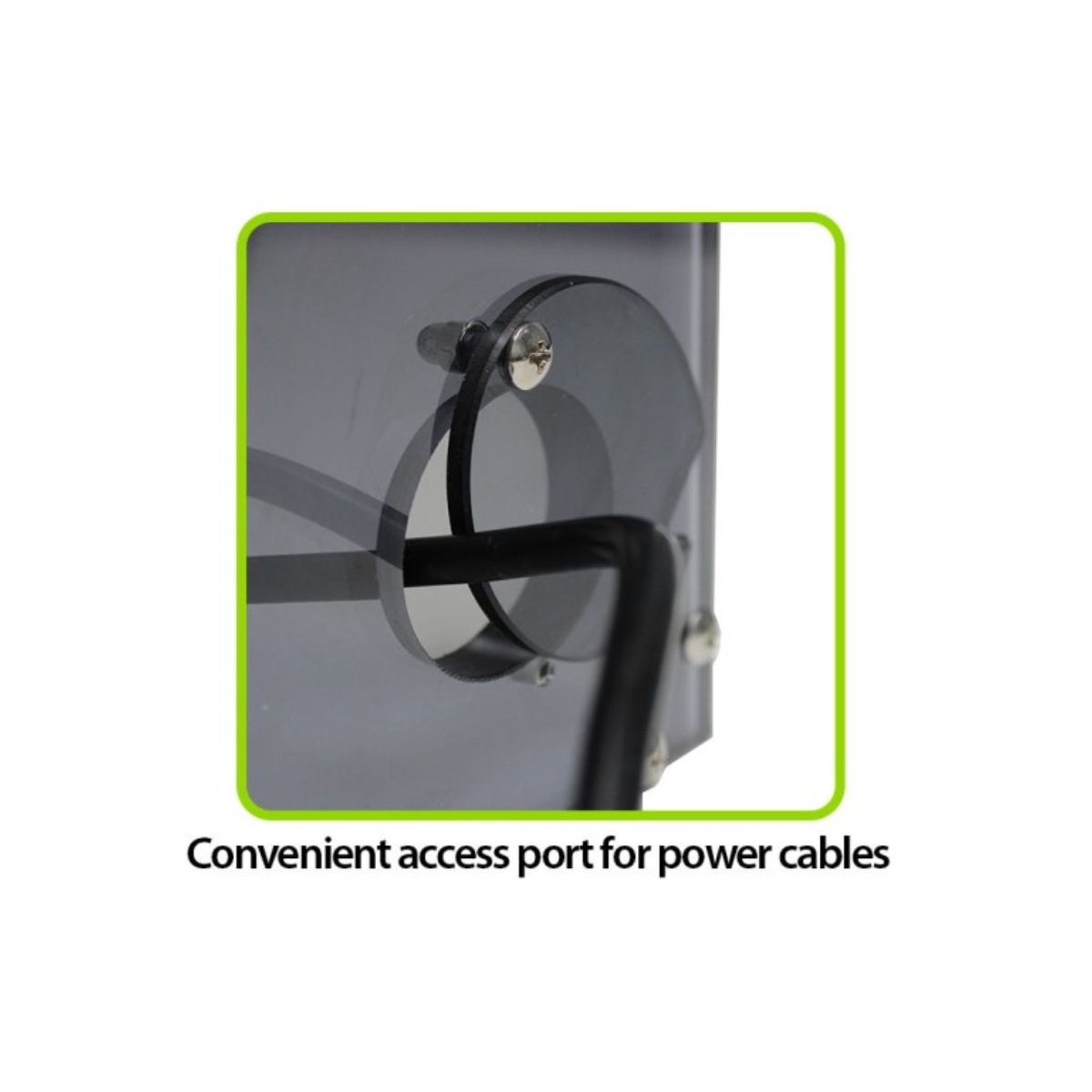 Ample lighting is provided by an energy efficient LED light source. Up to 3 standard size pipettes are accommodated by the pipette holder integrated within the storage shelf. Pipette tips and small instruments can also be stored away from the main workspace when not in use. Power cables can easily be routed through the access port on the right side of the chamber.