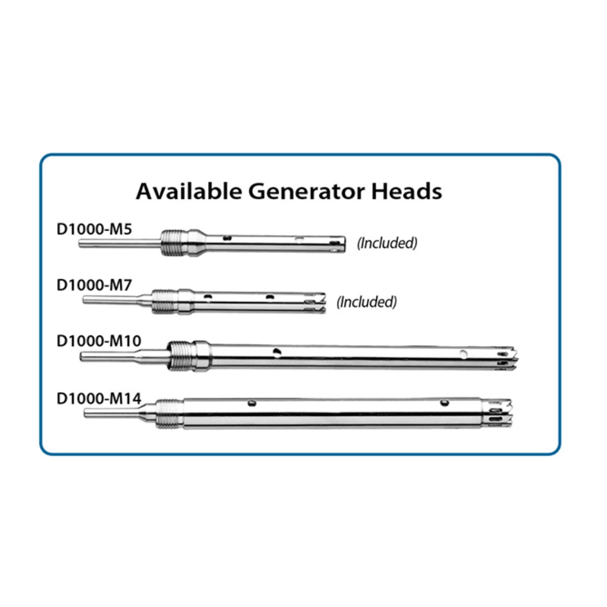 Generator probes are available in four sizes. The 5mm and 7mm diameter probes have a 50mm length for use with samples in microtubes. The 10mm x 115mm probe is ideal for use with 15 and 50ml tubes and the 14mm x 130 mm probe, for 50ml tubes and vessels up to 250ml. The unit is supplied with one each of the 5mm and 7mm generator probes. All the generator probes are made of stainless steel and can be sterilized by autoclaving.
