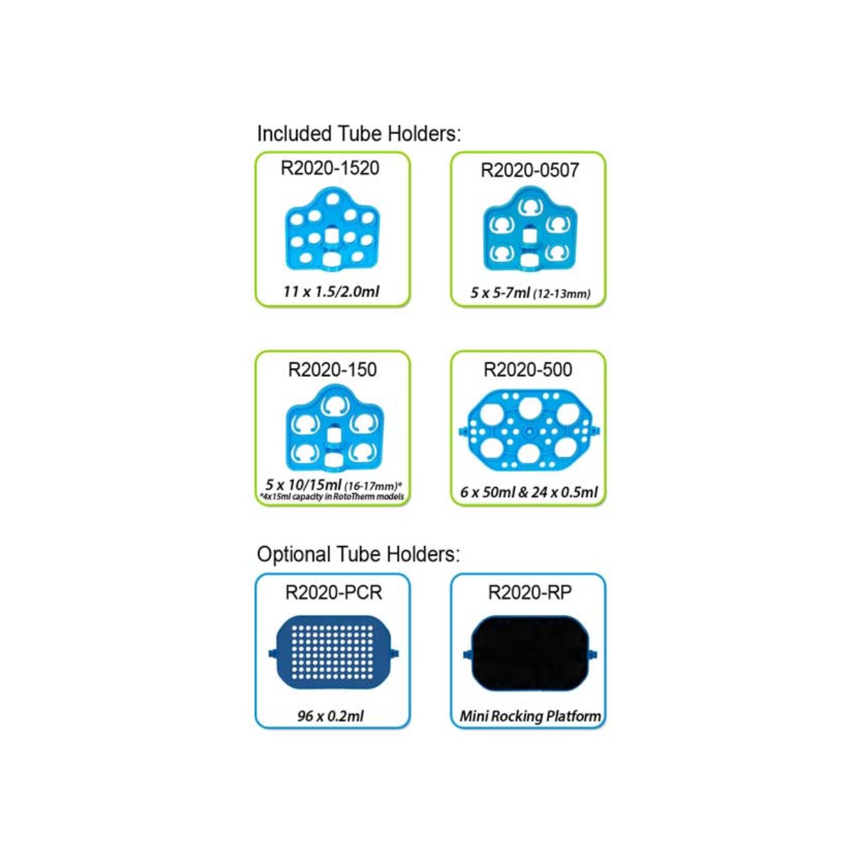 interchangeable tube holders for accomomodating all common tube sizes from 0.5ml to 50ml. The motion can be adjusted from vertical (end over end) mixing, to horizontal (rolling or hybridization style) mixing.